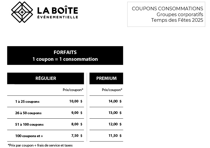 Valide pour toutes les consommations disponibles sur place. Les coupons consommations peuvent être commandés à l’unité pour un minimum de 10 et plus (par groupe). Taxes et service en sus.